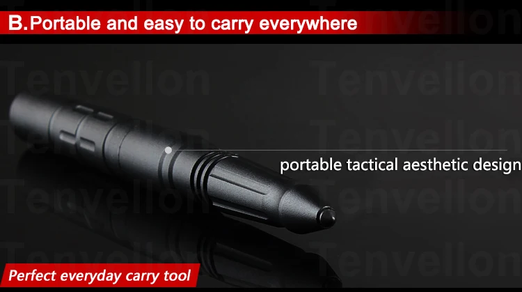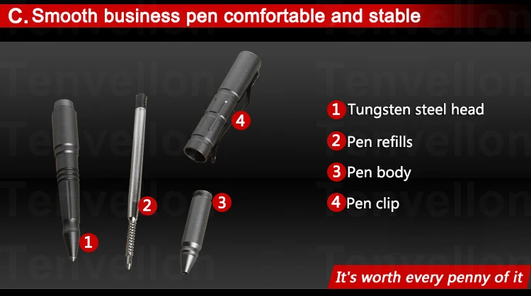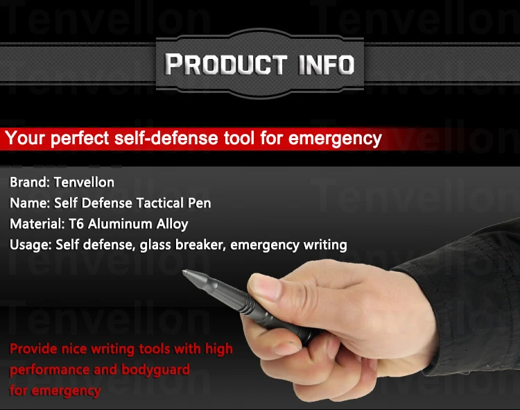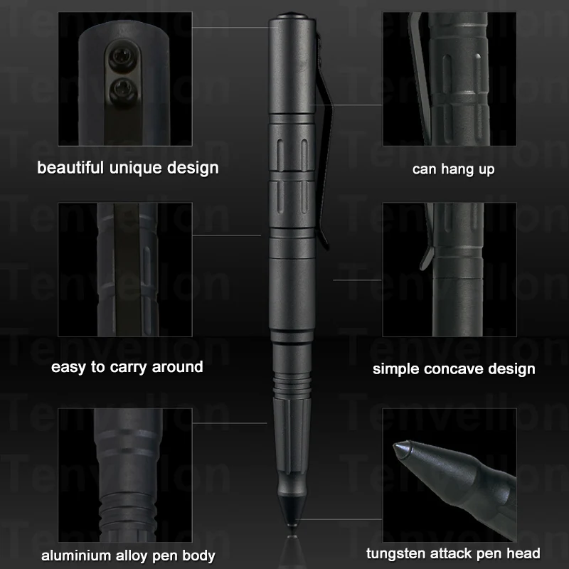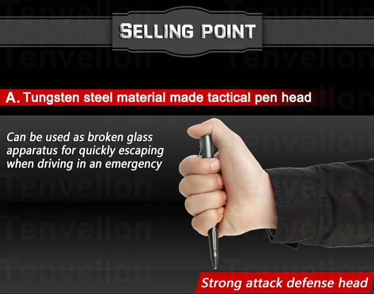 Application: Self defense Supplies Specifications: The self-defense tactical pencil pen head is made of tungsten steel through hard anodic oxidation III processing, which can be your perfect self-defense tool for the emergency. Provide nice writing tools with high performance and bodyguard for emergency Diamond shape design at the handle, excellent anti-skid ability Effect tactical action, improve safety coefficient Strong attack defense head, control criminals effectively Can be used as broken glass apparatus for quickly escaping when driving in an emergency Accord with ergonomic design, easy to hook on your backpack, bags, notebook Tungsten steel material made tactical pencil pen head, durable and practical Just rotate the pen holder to write Smooth business pen, round pen tip, comfortable and stable Package:1 x self-defense tactical pencil