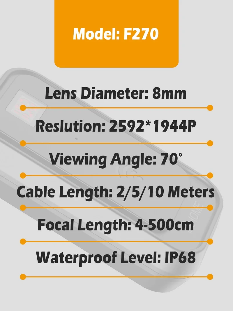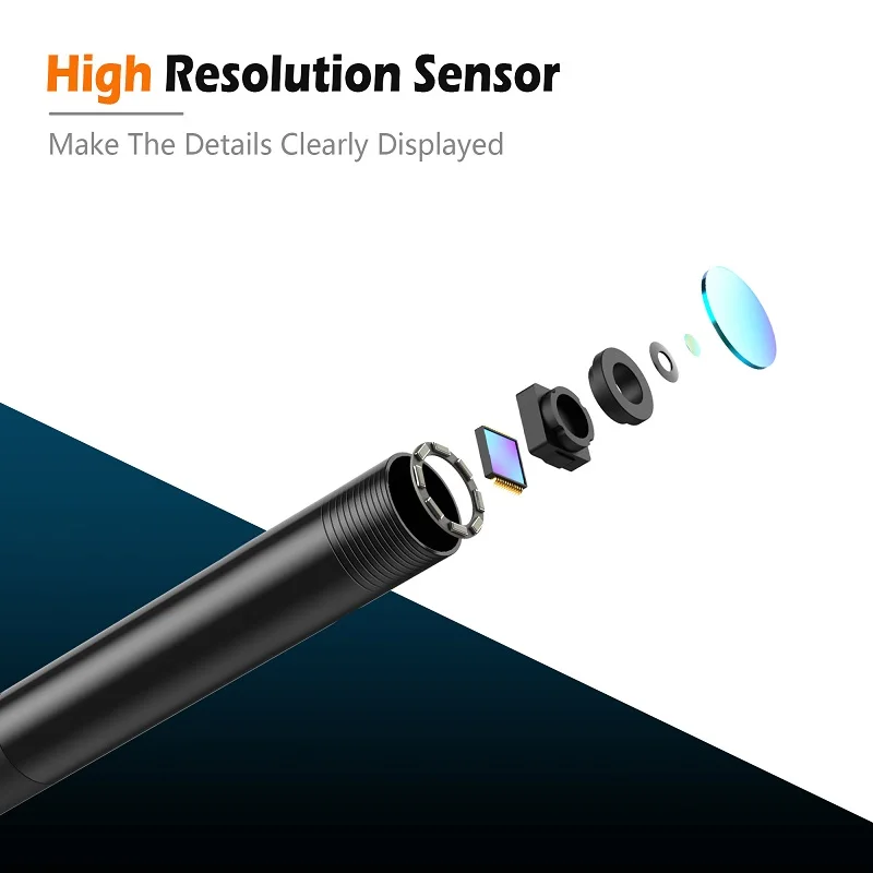 Features and specifications: Key features: specifications: F270-- Wifi Wireless Endoscope applicable to various types of smartphone, It is easily to operate and convenient to carry around. Most importantly, it support take photos and video and can Easily to check video footage at the same time. This product is equipped with 8mm diameter small camera probe. meanwhile, it can easily get into any place where you can't touch and sight cannot reach. Eight led make users to get a clear vision in dark environment. And also, make everything simple in all kinds of complicated environment. Waiting for you to develop more purposes with it! Model: F270 Lens diameter: 8mm Resolution: Real 5.0Million Pixels,2560*1920P View angle: 70° Frame rate: 30fps Focal distance: 5cm-500cm Waterproof: IP68 Working temperature: 0°-70°C Power: built-in 2600mAh lithium battery Working time:3-5 hours Image format: MJPEG Video format: MP4 Color: Black Cable length: 2m/5m/10m Rigid cable Resolution: 1) The lens does not auto-focus. 2) The best resolution distance is 5-10 cm. The resolution reduces when the distance is farther or closer. HOW TO USE ONE: Scan the QR CODE to download the app. TWO: Power on the product. THREE: Connect the wifi signal of your phone, which is transmited by the product. FOUR: Open the app, then you could see the image Strong Compatibility Compatible with IOS Android The True 5.0 Million Pixels A HUGE Image Clarity Improvement High Resolution Sensor Make The Details Clearly Displayed 3X Digital Zoom Electric quantity/Indicator light/Amplification/Power Switch/Shrink Adjustable Brightness IP68 Waterproof More widely used Built-in 2600mAh Lithium Battery Sustainable Work For 5 Hours Rigid Cable Semi-rigid Cable Is Able To Meet Your Application Needs Features and specifications: Key features: • Can record video and audio, files will be directly stored to your Android phone specifications: The newest type-- Wifi Wireless Endoscope,changed the traditional android endoscope's limitations of smartphone models and system requirements,It applicable to all the devive which with Wifi function(Include Iphone),It is compact,easy to operate and convenient to carry around.most importantly,it can be quickly connected to various types of smartphone,tablet,laptop and PC.Easily to check video footage,and support take photos and video at the same time.This product is equipped with 8mm diameter small camera probe.meanwhile,it can easily get into any place where you can't touch and sight cannot reach.Six leds make users to get a clear vision in dark environment.And also,make everything simple in all kinds of complicated environment.Waiting for you to develop more purposes with it! Resolution: 1) The lens does not auto-focus. 2) The best resolution distance is 3 – 6 cm. The resolution reduces when the distance is farther or closer. (View the following diagrams to learn more) WIFI Endoscope Explore unknown areas The difference between Hard cable with Soft cable the size of WIFI BOX is:60mm*33mm*17mm Brightness control knob & 6PCS LED light Ideal for working in dark areas Resolution distance: 1 cm Resolution distance: 3 cm Resolution distance: 6 cm Resolution distance: 10 cm IP67 international waterproof standard Camera tube can be completely immersed in water Convenient for picking up small items The suckers helps you stick the wifi transmitter to your phone