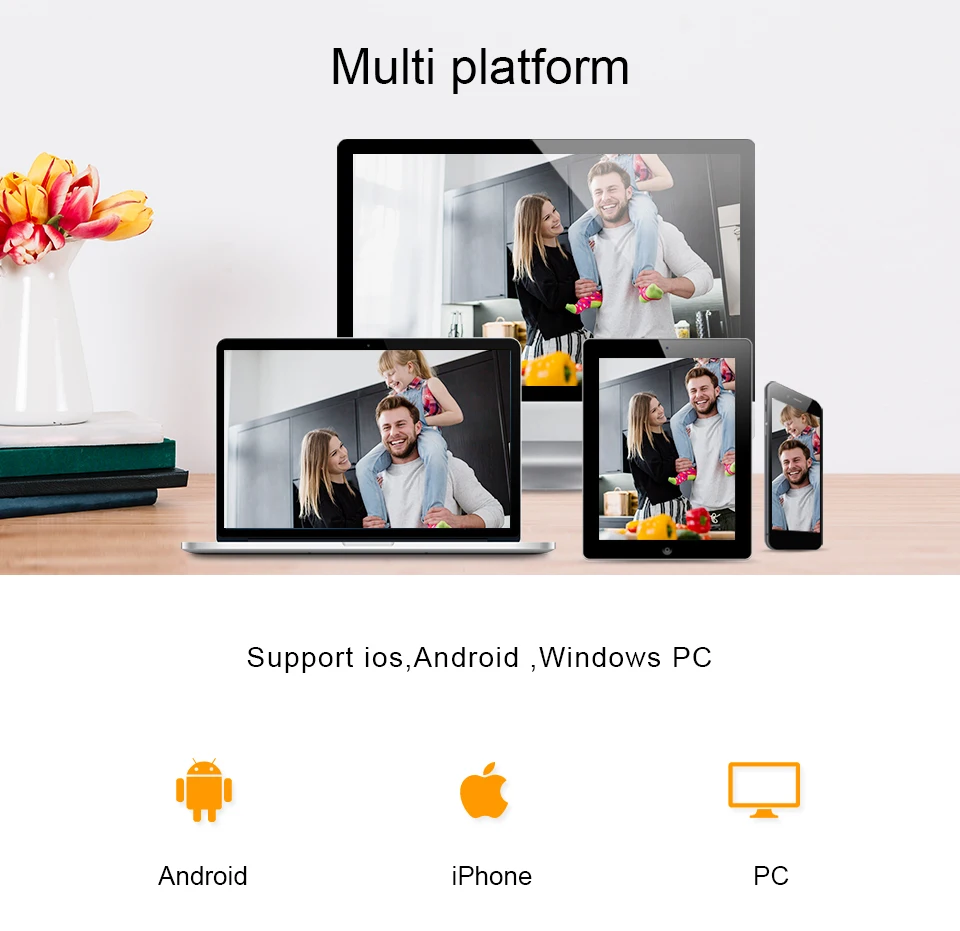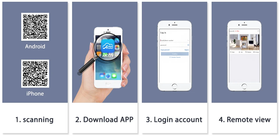 Support ios, Android,Windows PC. With the free app ARCCTV. you'll know that's happening even when you're not around, Receive notifications and view live or recorded footage right from your phone.