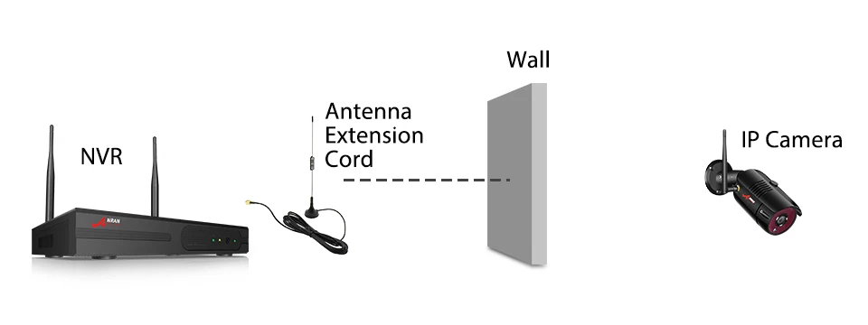 When WIFI signal is not strong enough against walls, you can replace the camera's antenna with an antenna extension cable. Pass the antenna around the wall. Passing the signal through the wall. (Not in the package, need to purchase separately)