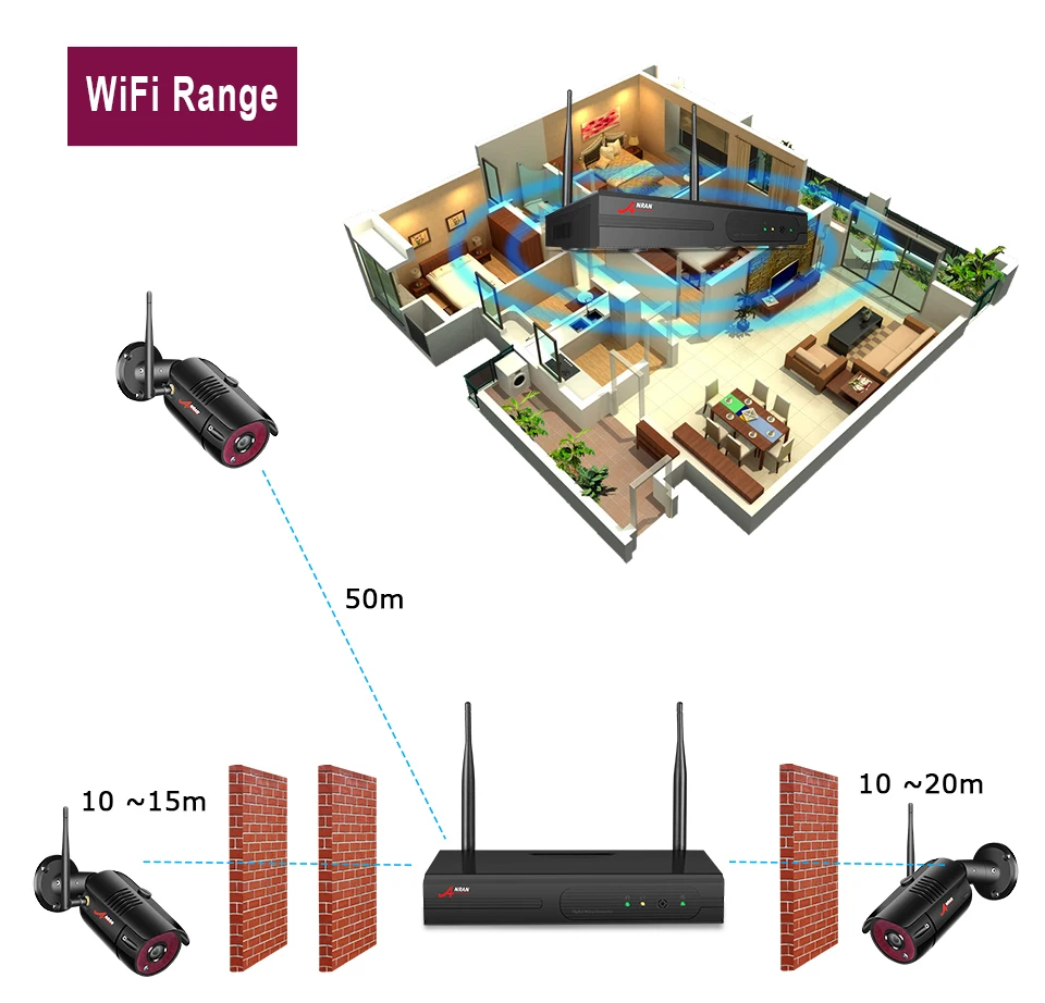Wireless connections between cameras and NVR,Free from complex cables.Range extender antennas ensure that the signals remain strong as you monitor your business or home wirelessly, up to 330ft(100 meters) in open area.