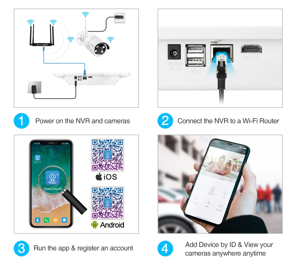 Connect the Surveillance Camera System to Internet. Download the Free “IP PRO” or "Eseecloud" APP on Your Smart Phone (iOS or Android), Enjoy Cameras Simultaneous Viewing on the App in your Palm. You can also View the Live View from Computer or Laptop via "Eseecloud" Software.Motion Detection & Email Alert