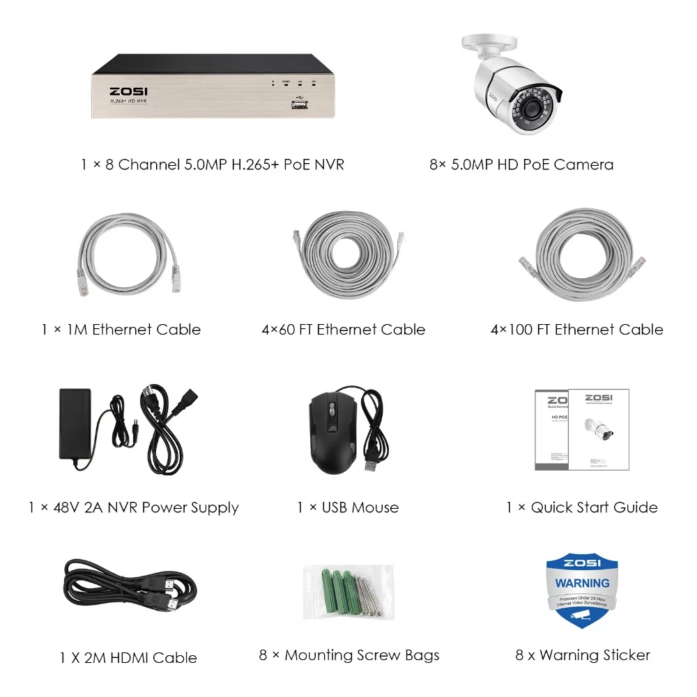 | ZOSI H.265+ 8CH 5MP POE Security Camera System Kit 8 x 5MP Super HD IP Camera Outdoor Waterproof CCTV Video Surveillance NVR Set |